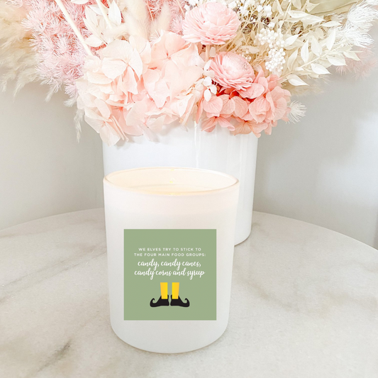 Hand poured 100% Natural Soy Christmas Candle | Elf Four Main Food Groups Candy Canes, Candy Corn and Syrup | Medium Candle